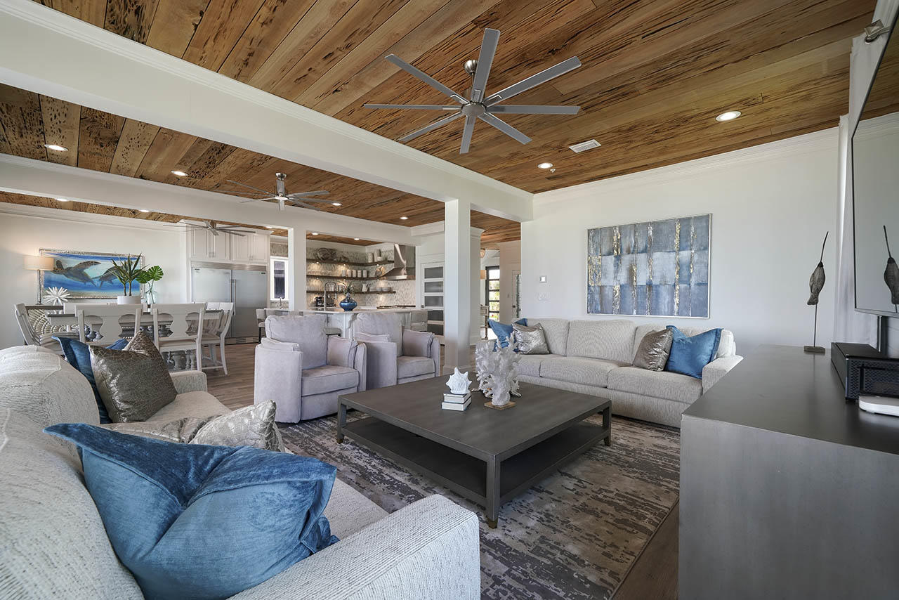 Introducing a newly built 6BR/6.5BA Coastal Modern waterfront estate in the gated community of Kelly Plantation. Designed with over 6,651 sq ft of heated/cooled space (8,917 sq ft total), this property offers 520 feet of deep-water frontage on Jones Bayou, a private heated saltwater pool and spa, and a 120' x 32' private boat dock with Tru-Flow composite decking.A 14' LED-lit paver driveway leads to the custom pivot front door and an expansive great room with a 26' lighted tray ceiling, Venetian-plaster gas fireplace, and large picture windows overlooking the water. The chef's kitchen features a Wolf gas range, Sub-Zero refrigerator/freezer, quartzite waterfall island, and a full butler's pantry with ice maker, beverage fridge, microwave, and sink. A glass-front wine room connects the kitchen and dining space, which opens directly to the outdoor kitchen and pool deck.