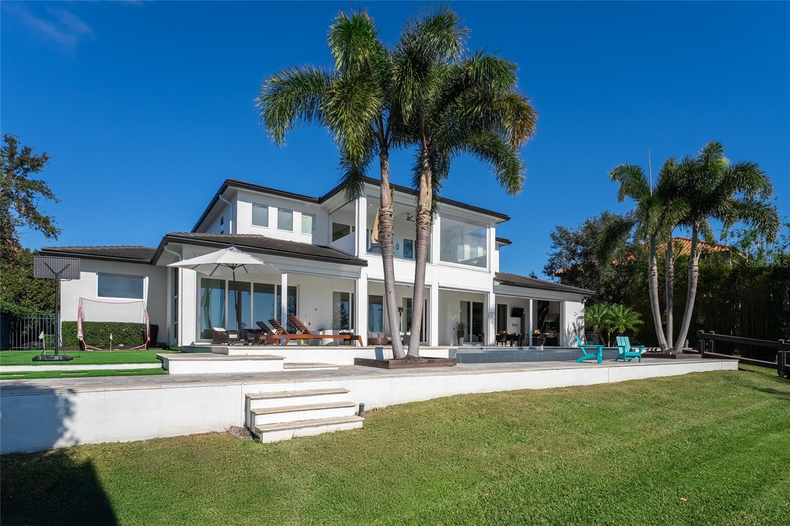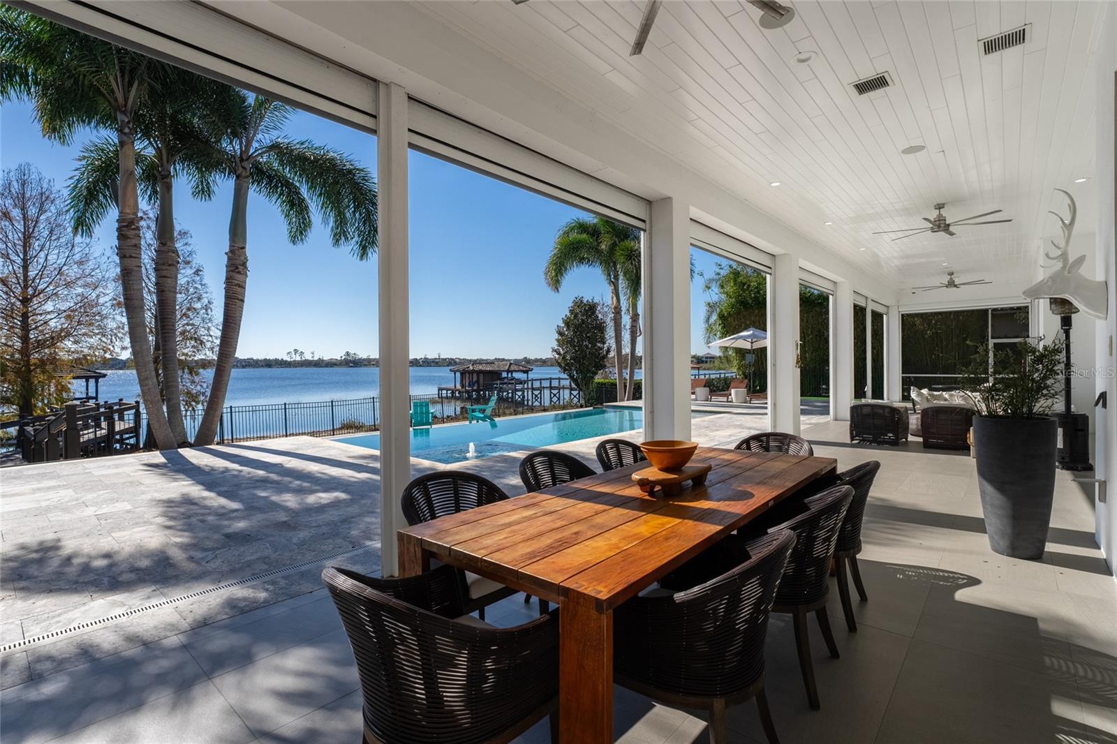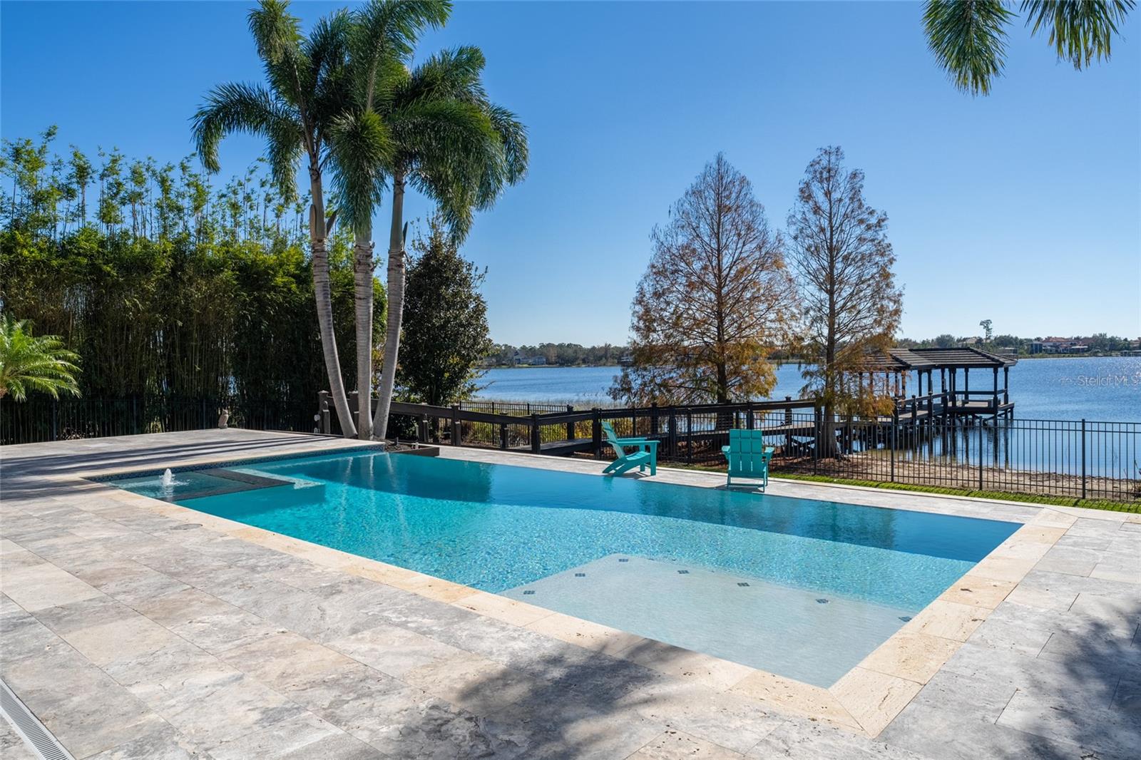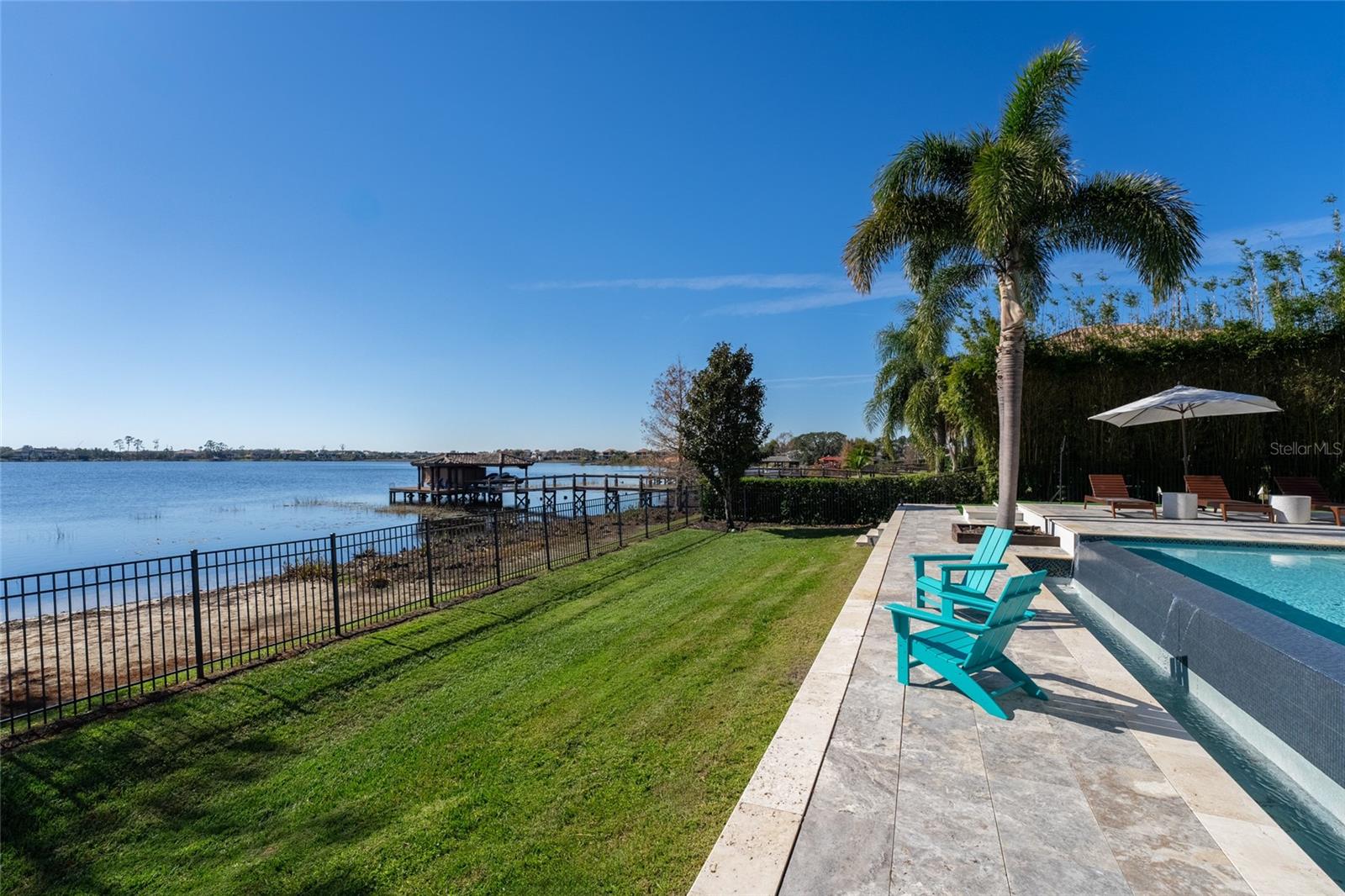 Welcome to an exquisite blend of luxury and sophistication in this fully furnished lakefront estate, nestled within the sought-after, guard-gated golf community of Keene’s Pointe in Windermere. Situated on an expansive 1.16-acre lot, this architectural masterpiece offers breathtaking views of Lake Burden and the nightly Magic Kingdom fireworks, visible from your private balcony or dock. Spanning over 5,260 square feet of masterfully designed living space, this custom-built residence features 5 opulent bedrooms, 5.5 elegantly appointed bathrooms, and a wealth of amenities tailored to a life of comfort, style, and seamless entertaining. The gourmet kitchen, a chef’s dream, is outfitted with granite countertops, bespoke cabinetry, professional-grade appliances, a spacious walk-in pantry, and a temperature-controlled wine refrigerator. Perfect for hosting gatherings, the kitchen opens to a sprawling covered lanai with a built-in barbecue area, where guests can enjoy lakeside dining and unparalleled views. The master suite is a serene retreat, featuring a cozy fireplace, a spa-inspired ensuite with a private sauna, an oversized double shower, and a custom-designed walk-in closet. Step directly onto the lanai to enjoy tranquil mornings or unwind under the stars. For those who work from home or require a private retreat, the residence includes a spacious office, beautifully appointed with custom cabinetry and built-ins, providing an ideal space for productivity and inspiration. Additional highlights include a state-of-the-art media room with a projection system and a professional-grade gym conveniently located in the garage. Outdoors, a private dock offers direct access to Lake Burden, perfect for boating enthusiasts or enjoying serene waterfront moments. Living in Keene’s Pointe enhances this unparalleled offering with access to its luxurious clubhouse, resort-style swimming pool, tennis courts, and the renowned Jack Nicklaus-designed Golden Bear Golf Course. These world-class amenities ensure a vibrant and fulfilling lifestyle within this coveted community. From its turnkey furnishings and meticulously crafted interiors to its enviable location and exceptional community amenities, this estate epitomizes the pinnacle of lakefront living. Schedule your private tour today to discover why this extraordinary property is the perfect choice for those who demand the very best. Recent improvements include a kitchen renovation (2023), stonework (2023), an upstairs AC unit (2024), two downstairs AC units (2023), water heaters (2023), a fireplace (2022), kids’ room renovation (2023), master bedroom renovation (2023), new travertine marble pool patio pavers (2022), and a mini golf section (2022).